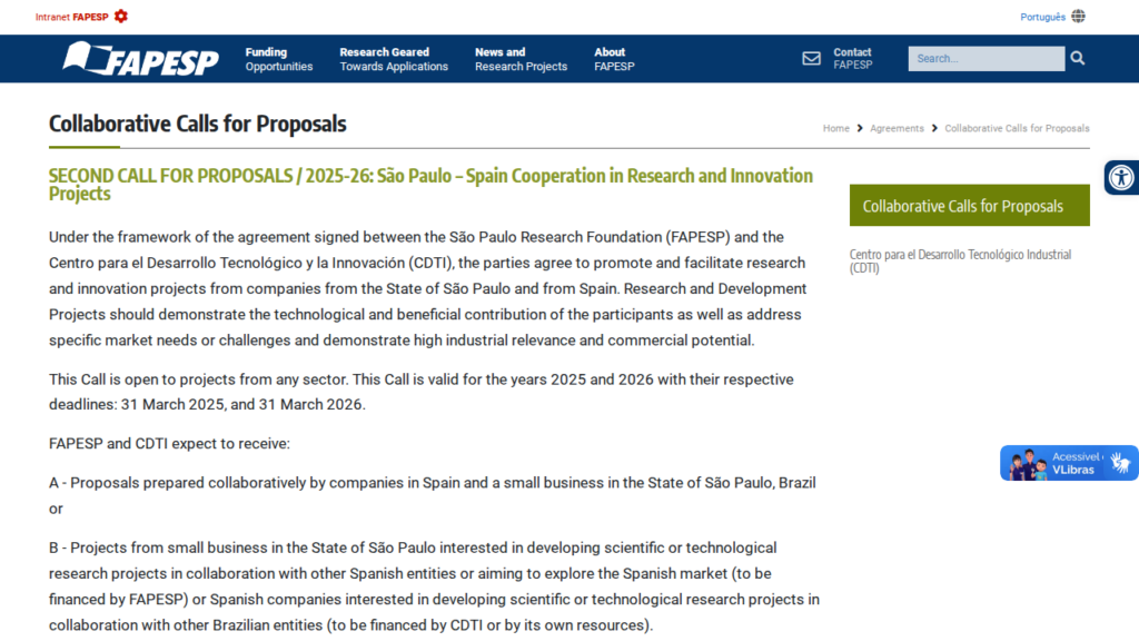 Open call for collaborative R&D projects with commercialization potential. Deadline: 31 March 2026. Funding via FAPESP (São Paulo) and CDTI (Spain).